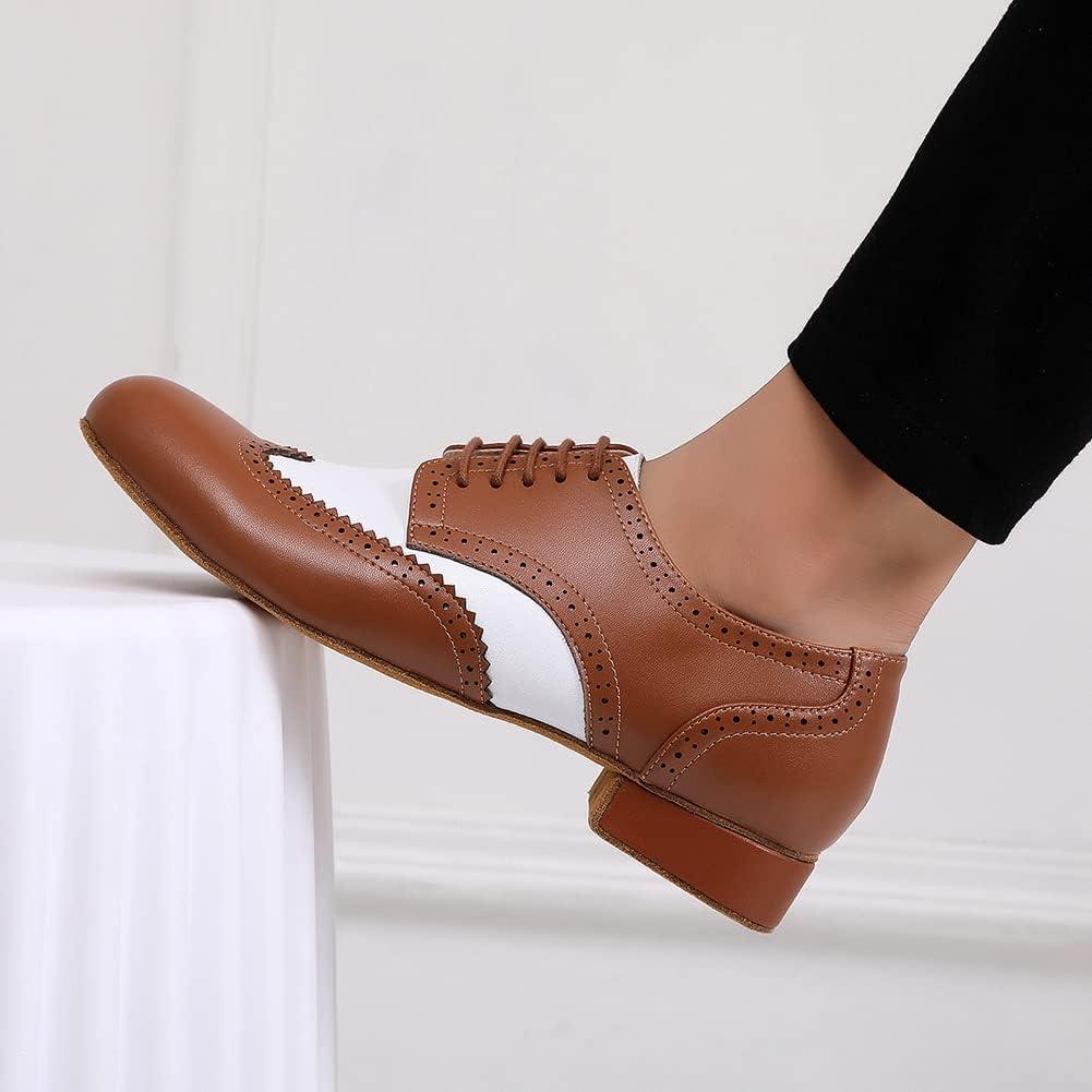 JUODVMP Mens Latin Dance Shoes Breathable 1" Standard Heel Leather Ballroom Tango Dancing Shoes Model 401(Qjw9012-brown-suede Full Sole)